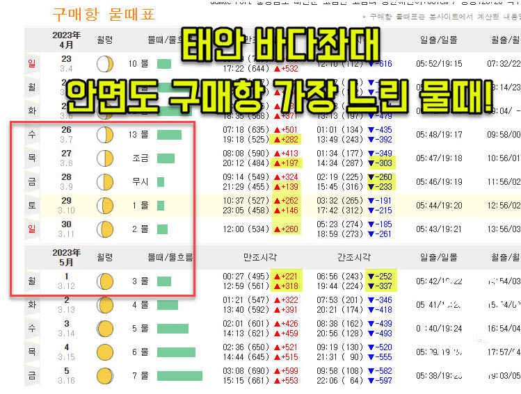 | 서해 바다좌대낚시 물때표보기 안면도 구매항좌대 물때 가장좋은 타임은? (0) | 2023.04.23 |