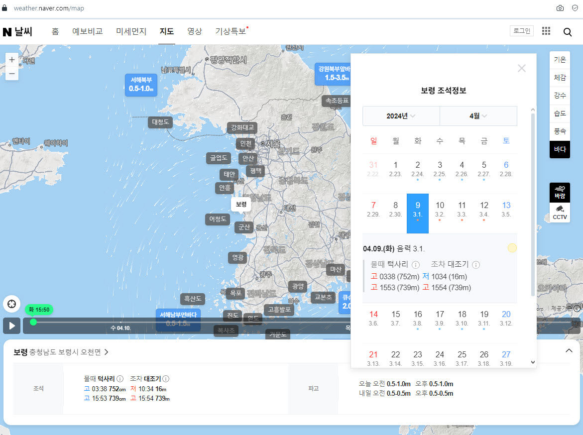 바다 클릭 → 원하는 지역 선택 (보령 선택) 그러면 위와 같은 물때표 물때달력까지 모두 함께 보실 수 있습니다.