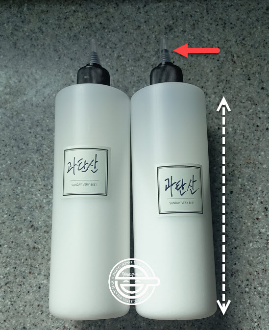빨간색 화살표 토출구 쪽 구멍 크기를 가위로 잘라서 과탄산 가루가 얼아마 뿌려지는 가를 보면서 조정을 했습니다.