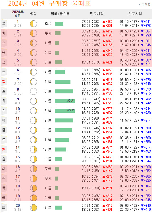 | 2024.03.26 - [Fishing/좌대낚시] - 서해바다좌대낚시 안면도좌대 해상팬션 물때표 달력보는방법 사리,조금,무시,7물,3물 |